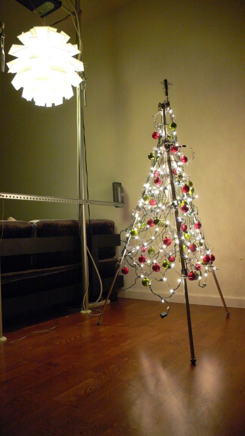 Otro «árbol» bastante curioso es éste de swissmiss, ¡realizado con un trípode! Imaginación no le falta desde luego porque únicamente consta del trípode y un conjunto de luces y bolas navideñas, sin embargo tiene un inconveniente, y es que si quisiera enviar la foto al VI Concurso de árboles de Navidad necesitaría comprarse otro trípode para hacer la foto y que no salga movida 🙂