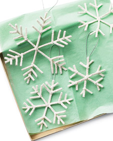 O estos copos de nieve, que están realizados a partir de «escobillas limpia pipas» (no sé si habrá mejor traducción al español de pipe-cleaners, son unas varillas flexibles delgadas que se usan para limpiar conductos de gas entre otros). Las hay de varios colores y se prestan para hacer muchos tipos de manualidades, como los copos en cuestión cuyo tutorial podéis encontrar también en el blog de Martha Stewart.