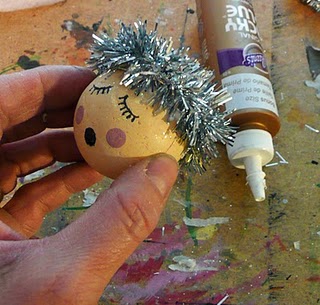 Lo primero es pintar la bola que hará de cabeza con la pintura de color carne. Se puede añadir algo de purpurina mientras se seca la pintura para que brille un poco.