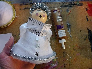 Ahora, con un trozo de espumillón de unos 20 cm de largo, enróllalo en forma de círculo y pégalo en la cabeza del ángel.