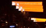En el primero, en el minuto 1:56, todavía no ha terminado de escribir el mensaje y elegir el logo de la felicitación y en un descuido de la cámara se ve que el mensaje ya estaba en los carteles luminosos.