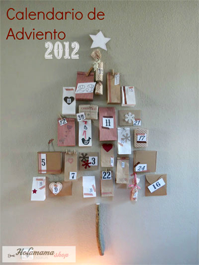 Empezamos por un curioso calendario con forma de árbol en el que los días son bolsitas o sobres de papel que van pegados a la pared. La primera imagen del post pertenece a este calendario, que luce así de bien visto entero: