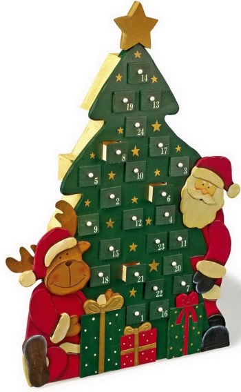 El primero es este simpático Papá Noel de 56 cm de alto, realizado en madera por la firma Handelshaus, que cuenta con 24 cajones numerados de forma desordenada (habitual en calendarios de este tipo). Al contar con 24 cajones sirve para todos los años, así que aunque cueste 21 euros en amazon.es, dado que es de madera aguantará todas las temporadas que le echéis.