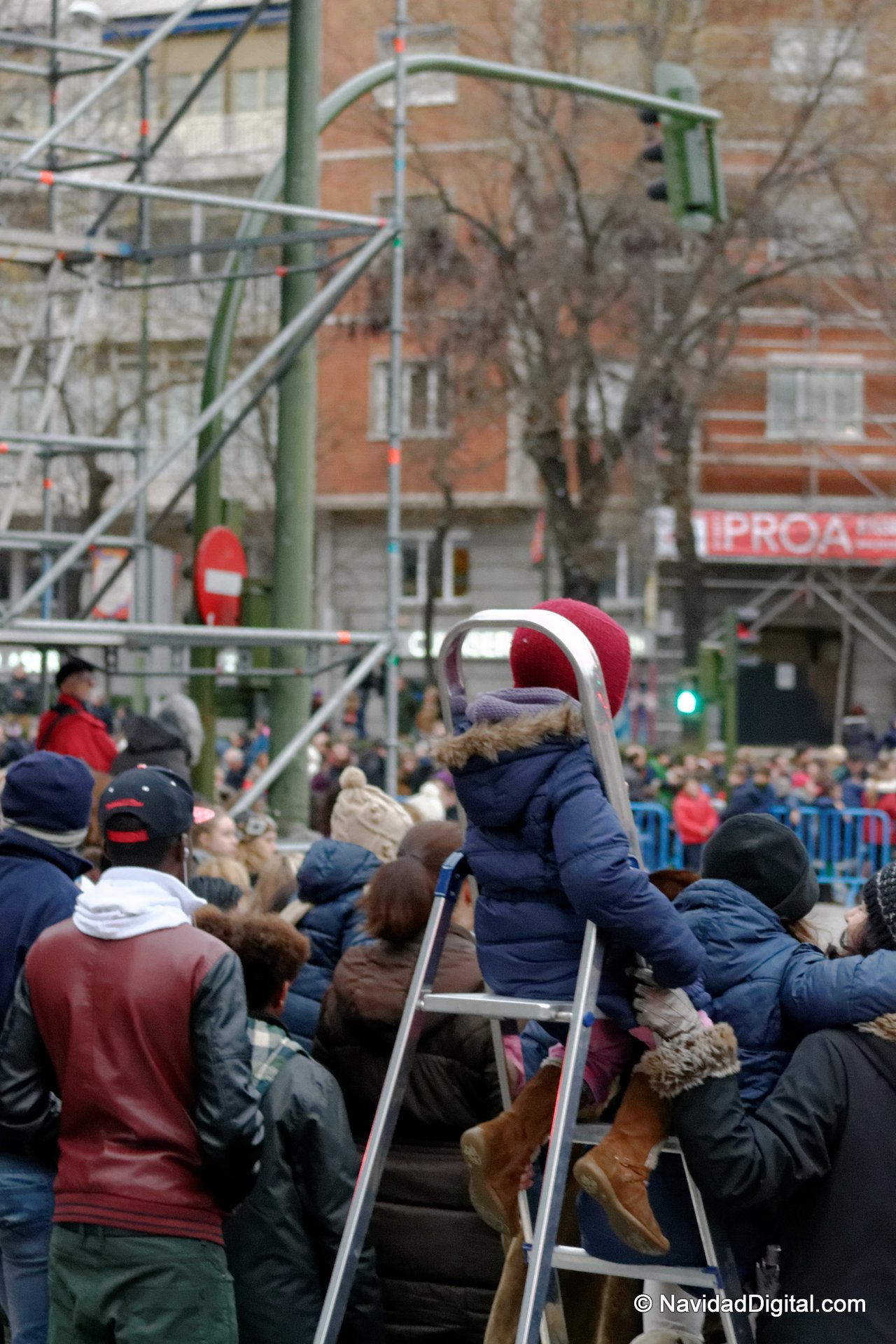 Como decía, tener una buena visión de la cabalgata era complicado, especialmente para los más pequeños… pero no pasa nada, se va uno con escaleras y ya está 🙂 Es increíble la cantidad de escaleras que podían verse, y hasta sillas. ¿Dónde quedó lo de subir a hombros al niño? ¡La próxima será construir un andamio o alquilar una grúa! 😀