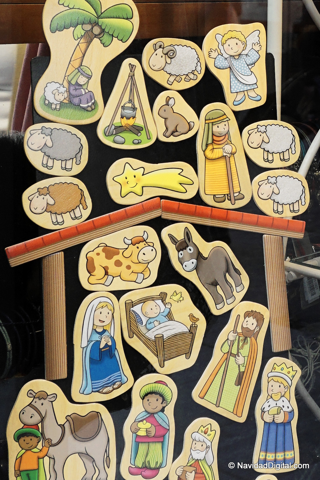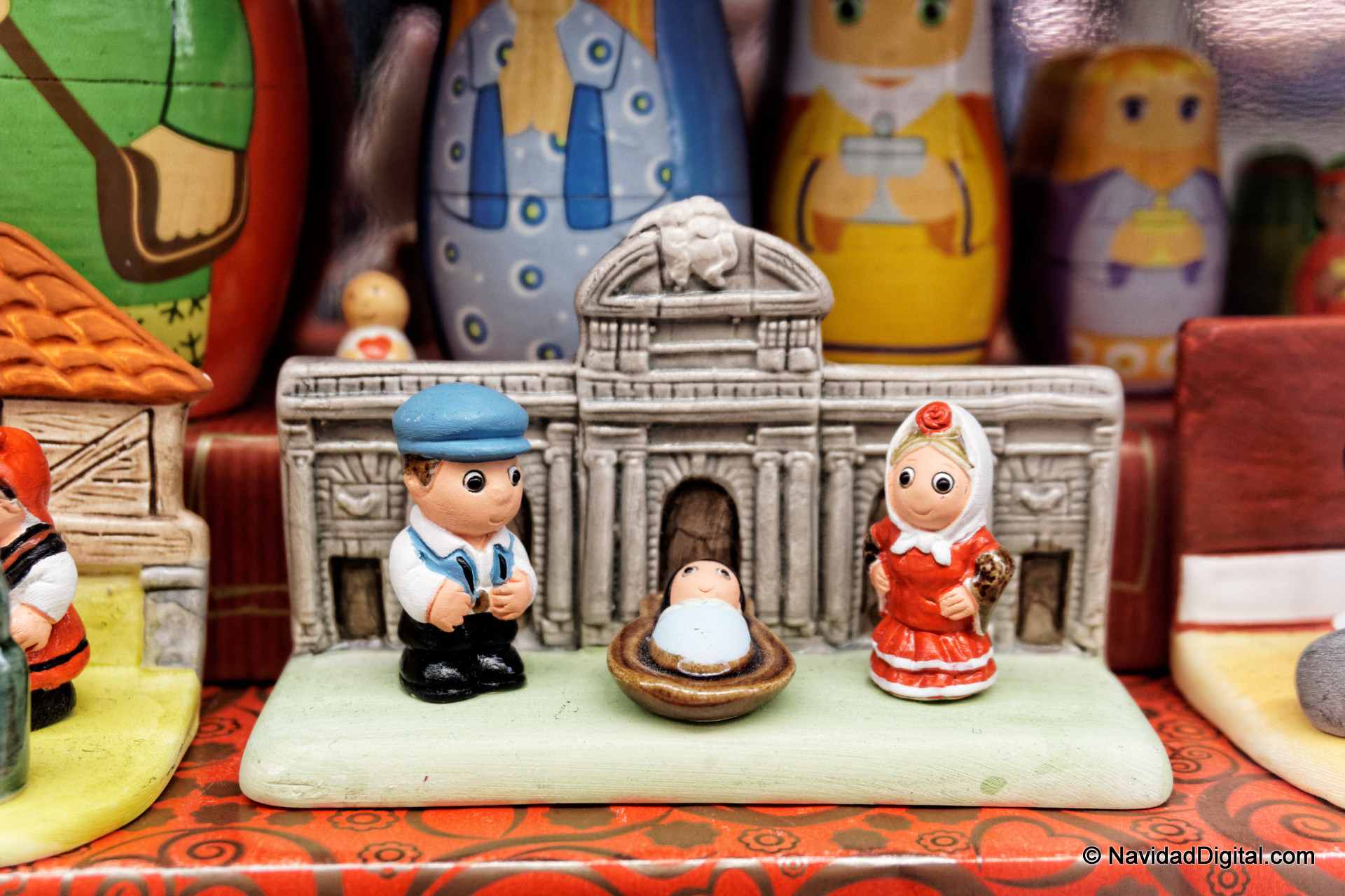 Las tiendas de regalos cercanas a la Plaza Mayor, que por cierto está también en obras rehabilitando la fachada, siempre tienen muchas referencias navideñas en temporada (por no hablar de los mercadillos). Hoy algunos asomaban tímidamente como el de la foto que encabeza este artículo donde la Puerta de Alcalá hace de improvisado portal de Belén «chulapo» o el belén hecho con dibujos de más arriba.