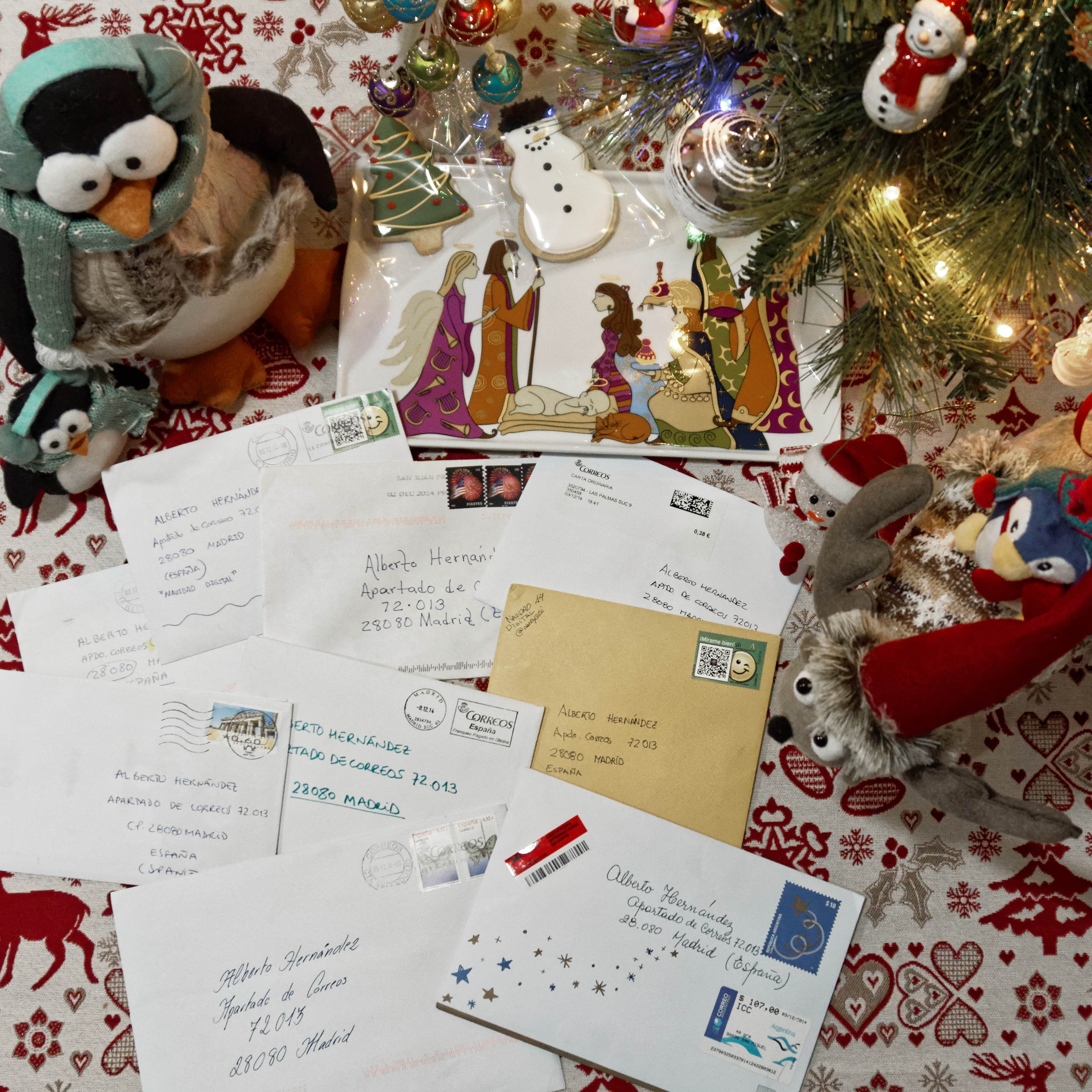 Ha sido una grata sorpresa que las postales vengan de diversos lugares del mundo, cobra más valor el eje central del experimento en el que nuestras felicitaciones viajan para reunirse en Navidad. De hecho quería agradecer la participación, y especialmente a los que se han animado a enviarlas estando fuera de España.